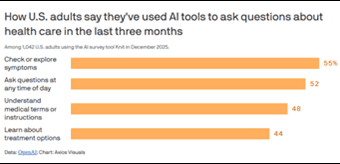 HIStalk - (Wednesday January 7, 2026) News OpenAI reports that 40 million people use ChatGPT each day for health information. Users ask it to help them decipher medical bills, spot charging errors, file insurance appeals, and in some cases diagnose conditions… |