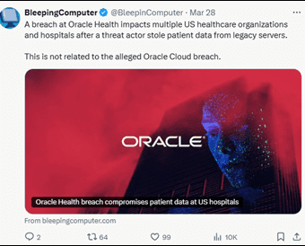 HIStalk - (Sunday March 30, 2025) Top News A hacker has breached Oracle Health systems and stolen patient data with the intention of extorting providers, according to a customer communication from Oracle. The FBI is investigating. |
