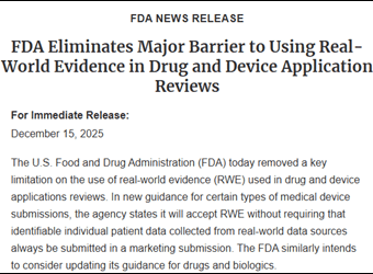 HIStalk - (Wednesday December 17, 2025) Top News FDA updates its policy to accept de-identified real-world evidence to support drug and device application reviews. This change allows use of registries, insurance claims, and EHR data that were previously excluded because they… |
